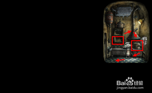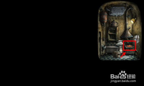 把锅端起来放在地上,在柜子里找到玉米并放在火上烤。爆米花时的震动会让窗户外高处的杆子失落落,捡起来交给窗户里的机械人。