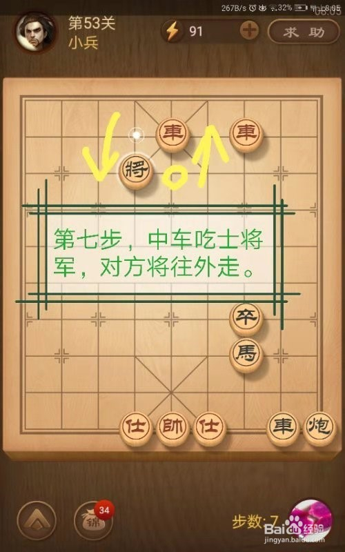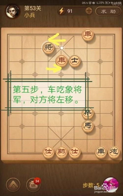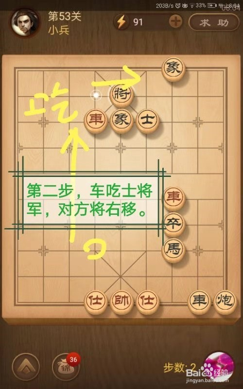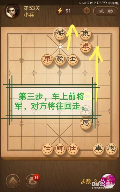打开手机,打开天天象棋,选择闯关,选择53关,棋局如图。