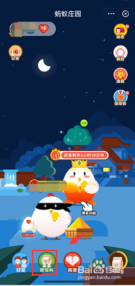 进入蚂蚁庄园,点击领饲料,如下图所示