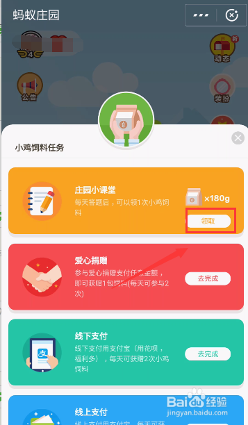 提醒回覆准确,点击去领取,就可以领到小鸡饲料了,如下图所示