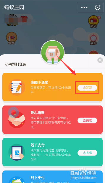 在领饲料选项点击蚂蚁小讲堂后面的去答题,如下图所示