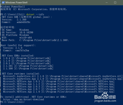 输入 dotnet --info 号令,若是呈现下列文本,且版本号中有方才下载的版本号则申明当作功,如下图所示: