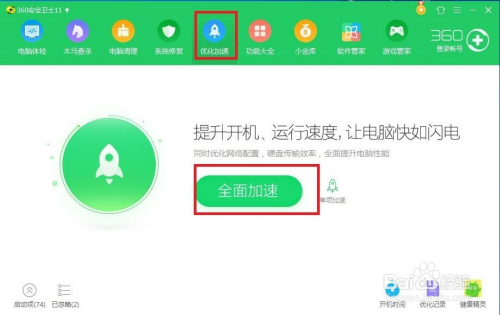 若是还想让电脑运行更快还可以点击上方的“优化加快”,之后点击“周全加快”对需要优化的软件优化就可以啦。