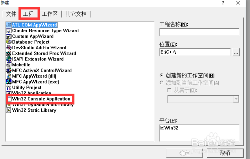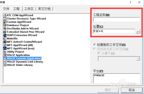 选择Win32 Console Application,在右边必然要输入工程名以及存储的位置,且工程名尽量不成以用中文字符