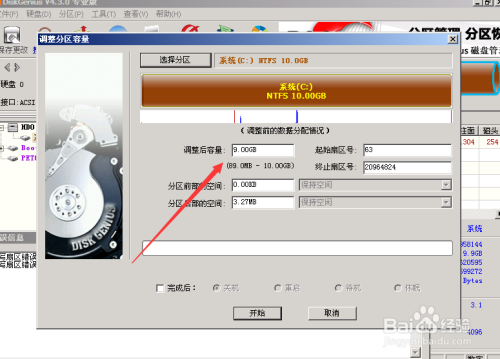 6、右键你的一个区,右键调整分区大小,这里10G调整为9G,执行确认