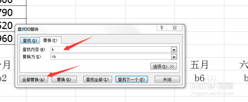 然后在【查找内容】中输入【a】,【替代为】后面输入【=a】,然后点击【全数替代】。