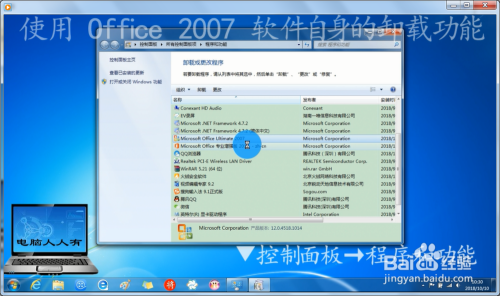 起头→节制面板→法式和功能→右键点击Office 2007→卸载(也可以更改→卸载)