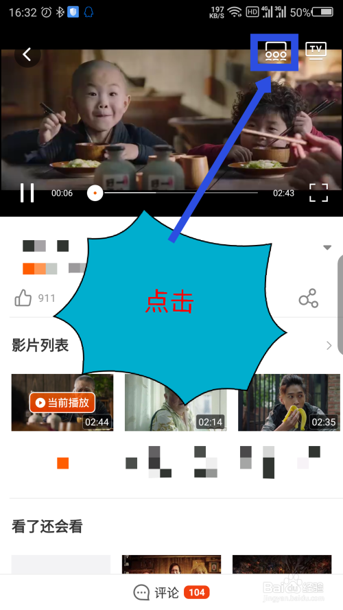 点击视频画面后,屏幕上会呈现一些可操作的选项,点击右上角电视图标左边的选项。如图所示