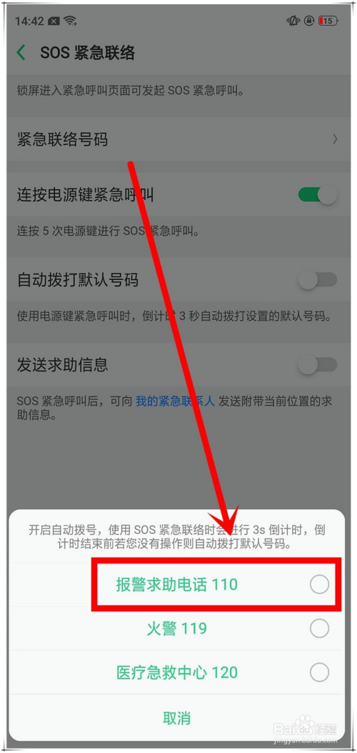 在SOS告急联络中开启告急联络功能后,默承认选报警号码号码为110、119和120。保举选择110。