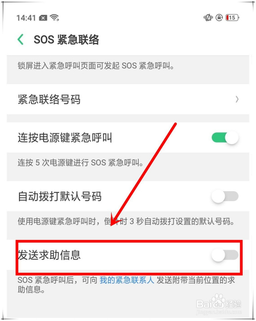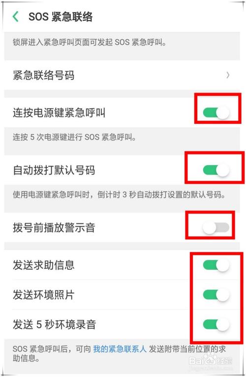 打开“发送求救信息”选项后面的开关,然后别离开启“持续电源键告急呼叫”、“主动拨打默认号码”、“发送乞助信息”、“发送情况照片”、“发送5秒情况灌音”等功能,封闭“拨号前播放警示音”功能。