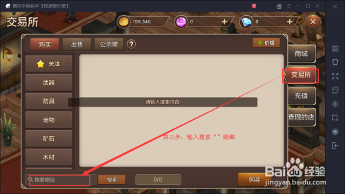 进入商城买卖所功能今后,在买卖所界面左下角的输入框中输入“螳螂”。而且点击搜刮。