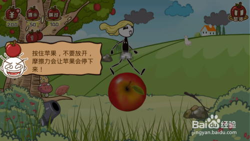 前两关为新手关卡,简单论述下:1、按住苹果,不铺开,摩擦力使苹果停下