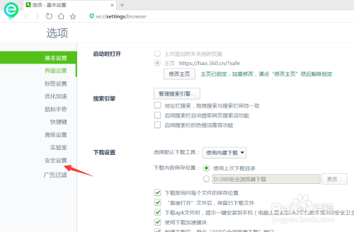 进入设置中间今后,我们要在选项里面找到平安设置,点击进入,如图中箭头所示