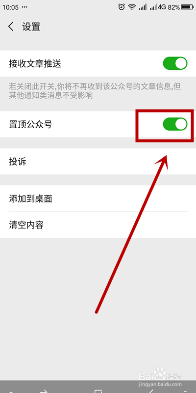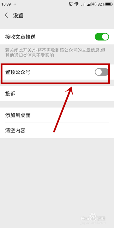 在设置页面,我们找到“置顶公家号”单击,后面的功能按钮由灰色变绿色,该功能打开