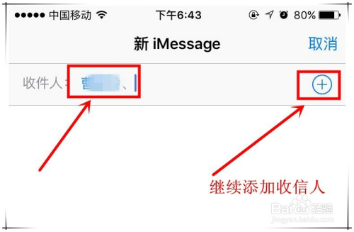 iphone7群发短信操作步调三:在新信息窗口中,点击右上角“+”号按钮,起头添加短信的收信人。
