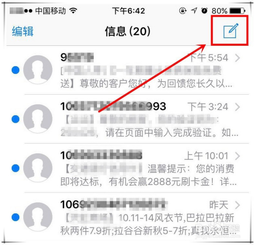 iphone7群发短信操作步调二:在打开的信息窗口中,点击右上角如下图所示按钮,建立新短信信息。