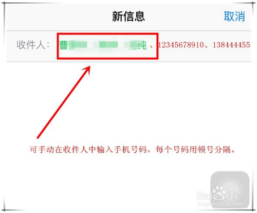 iphone7群发短信操作步调六:如斯频频操作,将所有你要群发短信的收信人名单添加进去。也可以本身直接在收信栏中手动输入联系人德律风号码,每个德律风号码用“、”分隔。