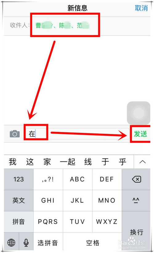 iphone7群发短信操作步调八:群发收件人添加无误后,就可以编写短信内容了。当短信内容编写好后,点发送即可将短信内容群发到所有收件人手机上。