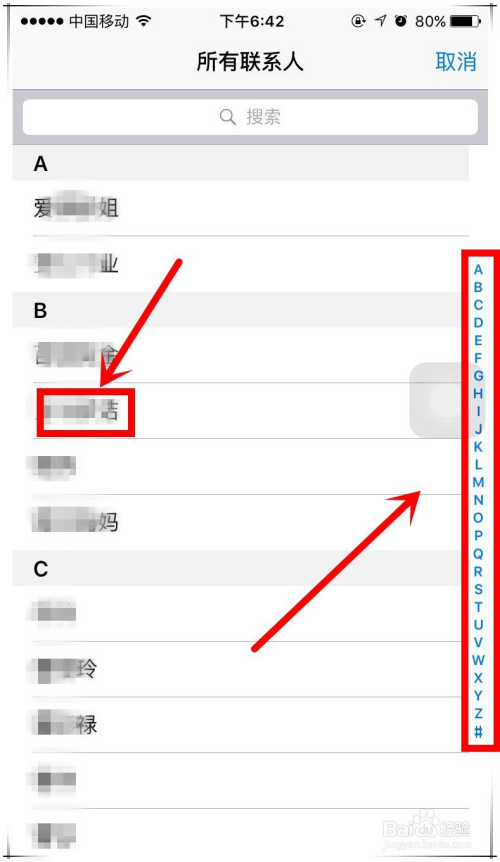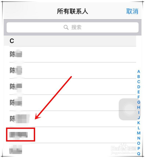 iphone7群发短信操作步调四:在弹出的所有联系人列表中,可经由过程上下滑动页面来查找要发送信息的联系人名单,也可以点击右侧英文字母,来快速定位以该字母开首的姓氏。