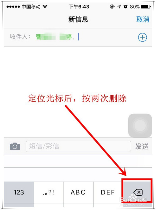 iphone7群发短信操作步调七:若是添加错了收件人,则可以点击收件人,将光标定位到该收件人名单后,按两次“删除”键,即可删除该收件人,删除收件人时,也要将多出来的“、”一并删除。
