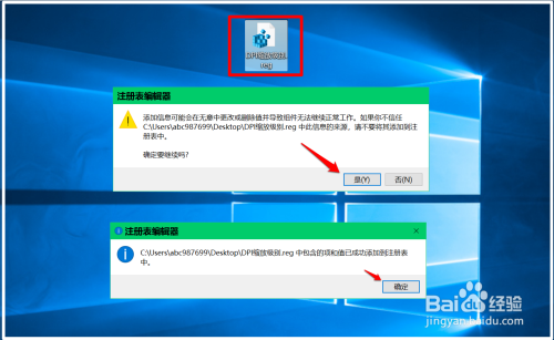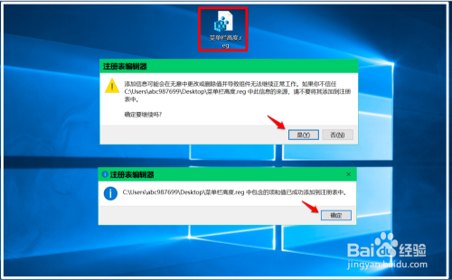 我们在系统桌面上找到并左键双击【菜单栏高度.reg】注册表文件图标,在先后弹出的注册表编纂器对话框中点击:是(Y)和确定。