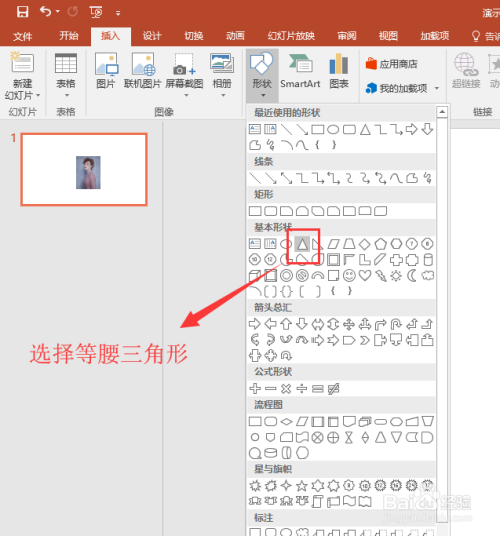 在选择插入菜单中的外形号令,在外形中选择等腰三角形外形,然后在幻灯片上绘制一个大小合适的等腰三角形出来。