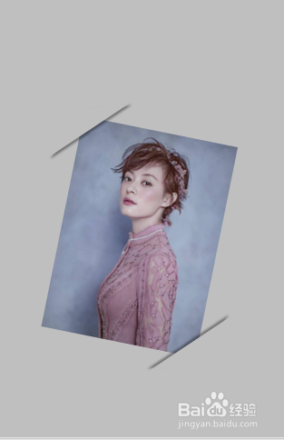 将这个扭转的等腰三角形移到照片的左上角位置,然后为这个等腰三角形设置一个外形结果中的右下斜偏移暗影结果;然后按住Ctrl键将这个等腰三角形在复制一个出来,放在照片的右下角位置上。