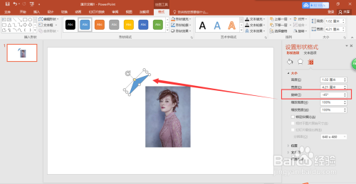 将这个等腰三角形压扁,然后打开“设置外形格局”窗口,在设置外形格局窗口中设置等腰三角形的扭转角度为-45度。