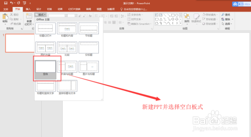 打开PPT 2016软件,新建一个PPT演示文稿,在新建的演示文稿中找到板式,单击板式鄙人拉呈现的浩繁板式选择中选择一个空白的板式。
