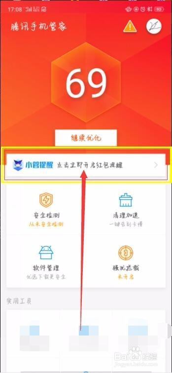 在手机管家本家儿界面有一个小管提醒,点击它就可以当即开启红包提醒。我们点击它进入下一步操作,如图所示。