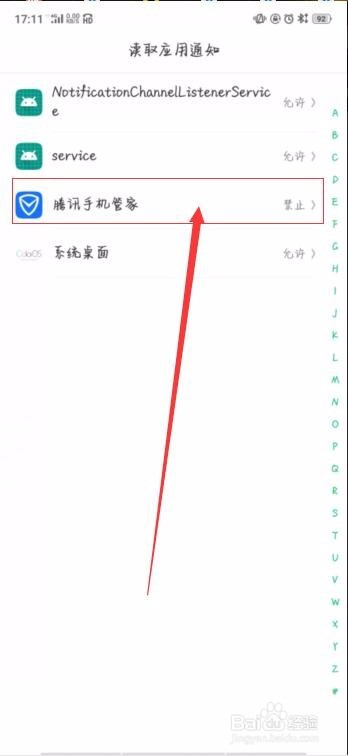 之后就进入了通知栏读取应用界面,找到并点击腾讯手机管家栏,如图所示。