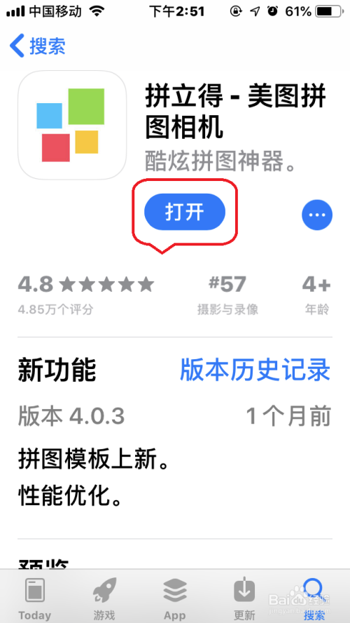 苹果应用商铺搜刮“拼立得”,点击“获取”下载安装该应用。