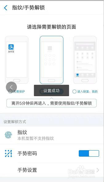 弹出设置当作功按钮即设置完当作,当我们下次再进入付出宝时,就会弹出输入手势,若果输入准确则进入付出宝,不然提醒手势不准确。