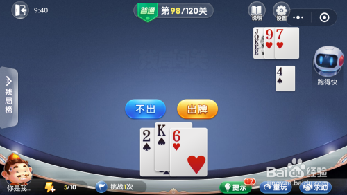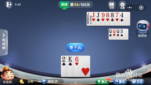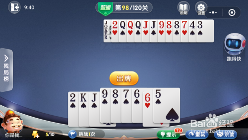 第98关先打出5-9顺子,接着打出一张J,跑得快打出一张2。