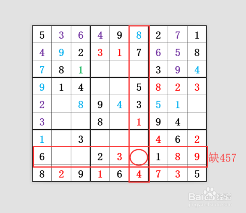 首先我们先看最中心的三个宫。第五横行和第六横行都有了9,且两个9别离在第五宫和第六宫,那么第四宫的9应该在第四横行,第四宫第四横行只有一个空位就是9。这种操纵相邻三个横宫或竖宫有两宫有不异数字的解法,小编叫三宫二数解法。
