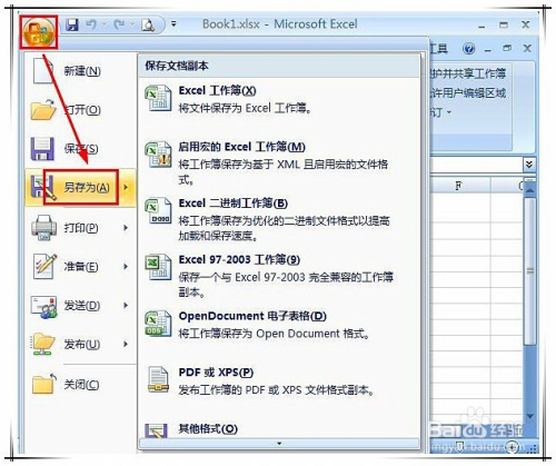 点击excel应用法式左上角按钮,弹出菜单中选择“另存为”。