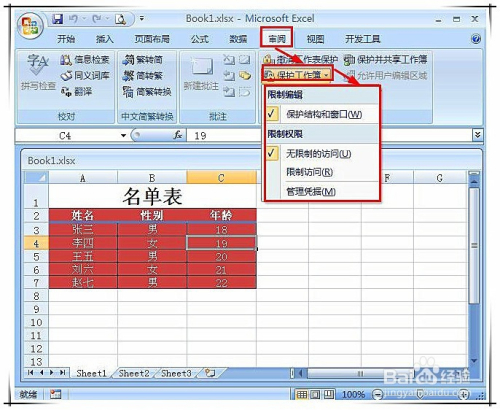 在东西栏中切换到“核阅”选项卡,点击“庇护工作薄”按钮,打开下拉菜单。