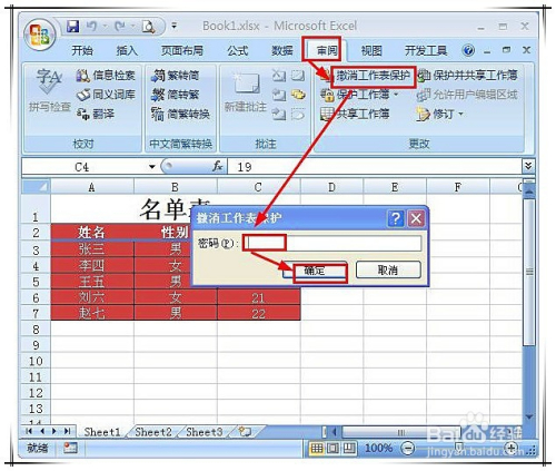 同样在“核阅”选项卡,点击“撤销工作表庇护”按钮,在弹出的“撤销工作表庇护”对话框中,输入准确的密码,点击确定,即可打消失落工作表庇护密码。
