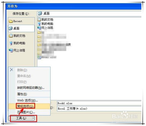 在弹出的“另存为”窗口中,点击如下图所示的“东西”按钮,在弹出菜单中选择“常规选项”。