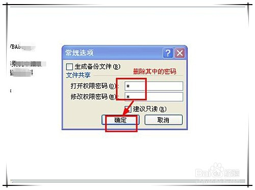 在弹出的“常规选项”窗口, 将“打开权限密码”、“点窜权限密码”后的文本框清空,点击“确定”。