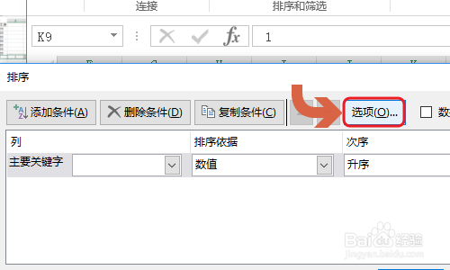 接着按住Ctrl+A选中整个单位格,然后依次点击“数据”-“排序”,在弹出的排序对话框找到右上角的“选项”;