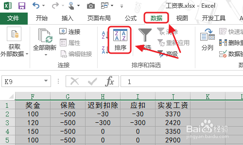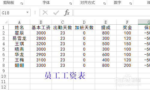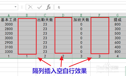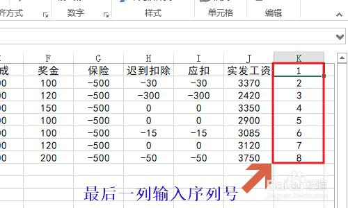 我们以下图的一张员工工资表为例,假如想要在隔行之间插入空白行,首先就要在每一行的后面输入对应的数字序号,如图...
