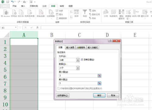 在数据验证窗口设置参数,验证前提许可选择小数,然后在最小值和最年夜值中输入对应数值,教程以最小值为2,最年夜值为5为例,设置好这些参数之后单击确认保留即可。此时在A列中只有输入介于2-5之间的数值才有用,不然会弹出警示。