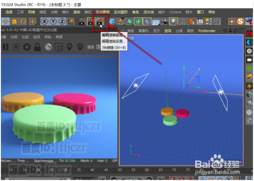 首先选以前建立的一个小模子(瓶盖)来搭建一个小场景(盖子的建立方式可参考所给引用经验);在场景平分别添加了二个灯光,还有一个L型板作为地面。