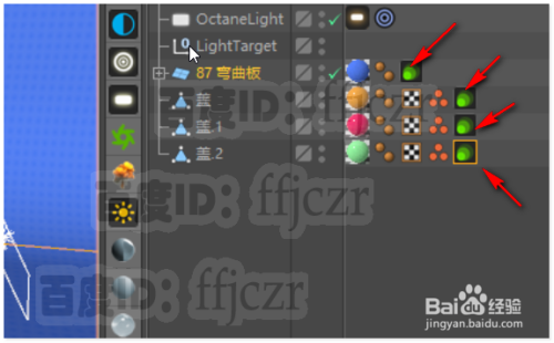 首先,要给场景的对象添加一个OC的对象标签,在这场景中属于输出的对象为:地面、和三个盖子;在响应的对象上点鼠标右键,添加上OC的对象标签。如图所示。