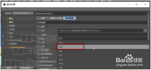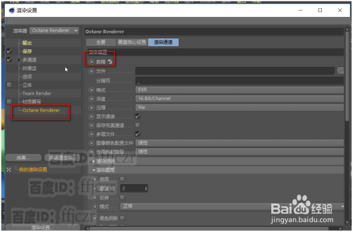 点选OC衬着器,选择衬着通道选项,勾选启用,并将输出格局调整为PDS。