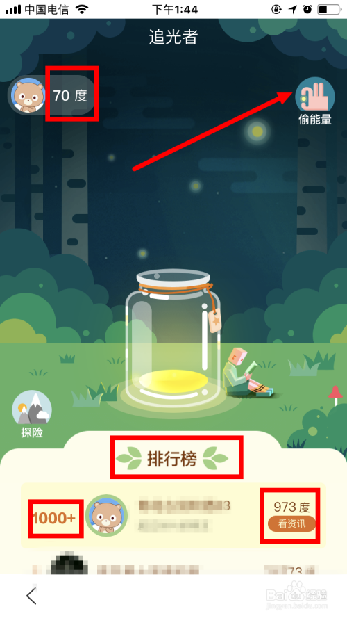 将页面中的能量收集完后,我们再来细心看一下这个页面中的其他信息。左上角显示的是我们此刻有的能量数,以 度 为单元。页面下端的是 排行榜 ,会显示我们总共收集的能量数,以及排名。右上角有个 偷能量 的图标,下面还有个 探险 的图标。先点击 偷能量 ,来看看。