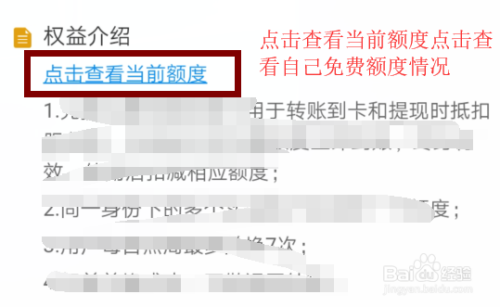 操作五:在提现免办事费界面,下方找到权益介绍,在权益介绍找到点击查看当前额度,如许可以查看本身今朝的免费额度环境,操作图片步调如下。