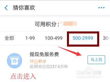 操作四:点击进入更多选项卡,选择500-2999积分分段,然后点击提现免费办事,点击进入查看额度环境,操作图片步调如下。