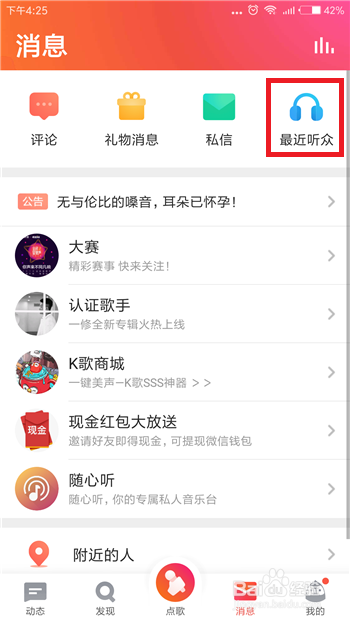 首先要和大师说的一点就是全平易近K歌中最新的听众就是别人拜候我们本家儿页的记实,我们先找到比来听众,打开全平易近K歌后在底部点击【动静】。
